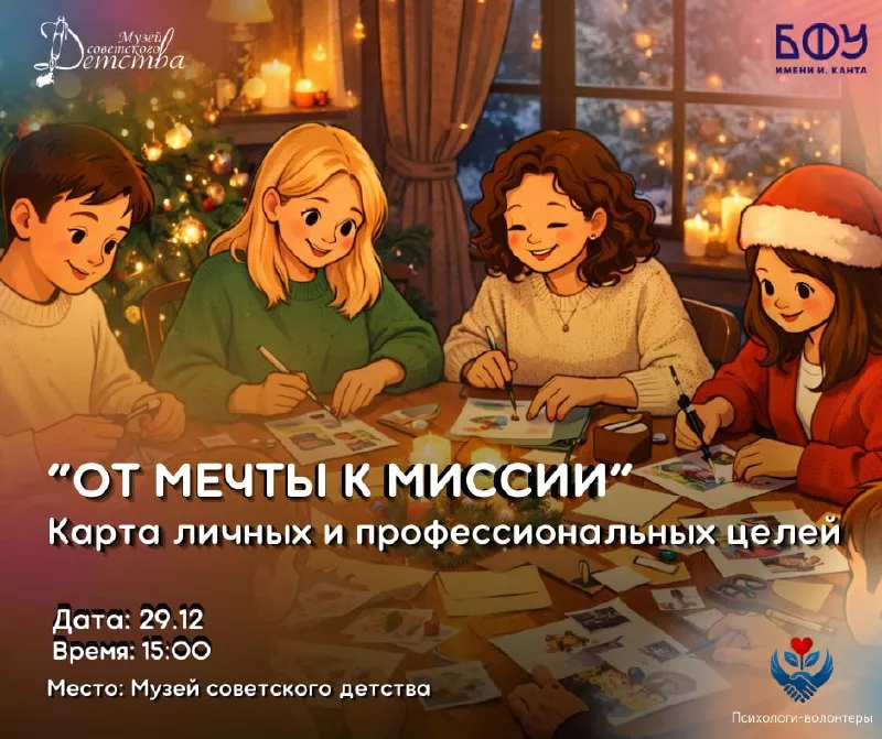 В честь наступающего Нового года психологи-волонтеры БФУ приглашают всех в Музей советского детства на мастер-класс по постановке целей. Это глубинная работа по созданию своего жизненного вектора, где личные устремления обретают силу осознанной миссии.
