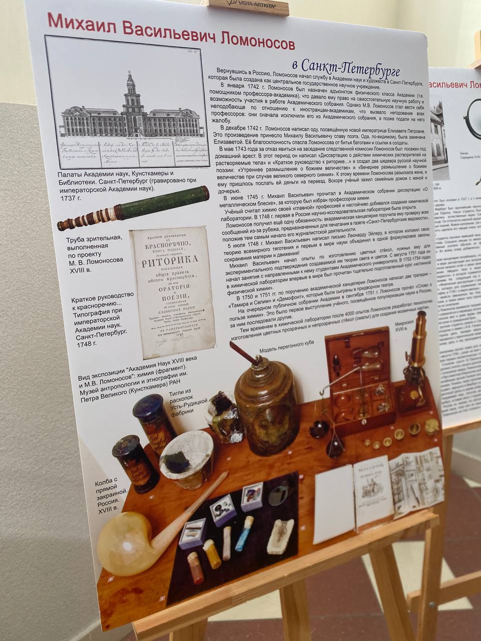 Особое внимание в экспозиции уделено жизни и творчеству М.В. Ломоносова, в частности его знаменитой усадьбе Усть-Рудица и фабрике цветного стекла. Выставка создана на основе материалов Краеведческого музея г. Ломоносова, Музея антропологии и этнографии им. Петра Великого «Кунсткамера» и Историко-мемориального музея М. В. Ломоносова.