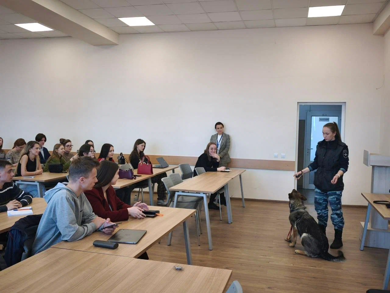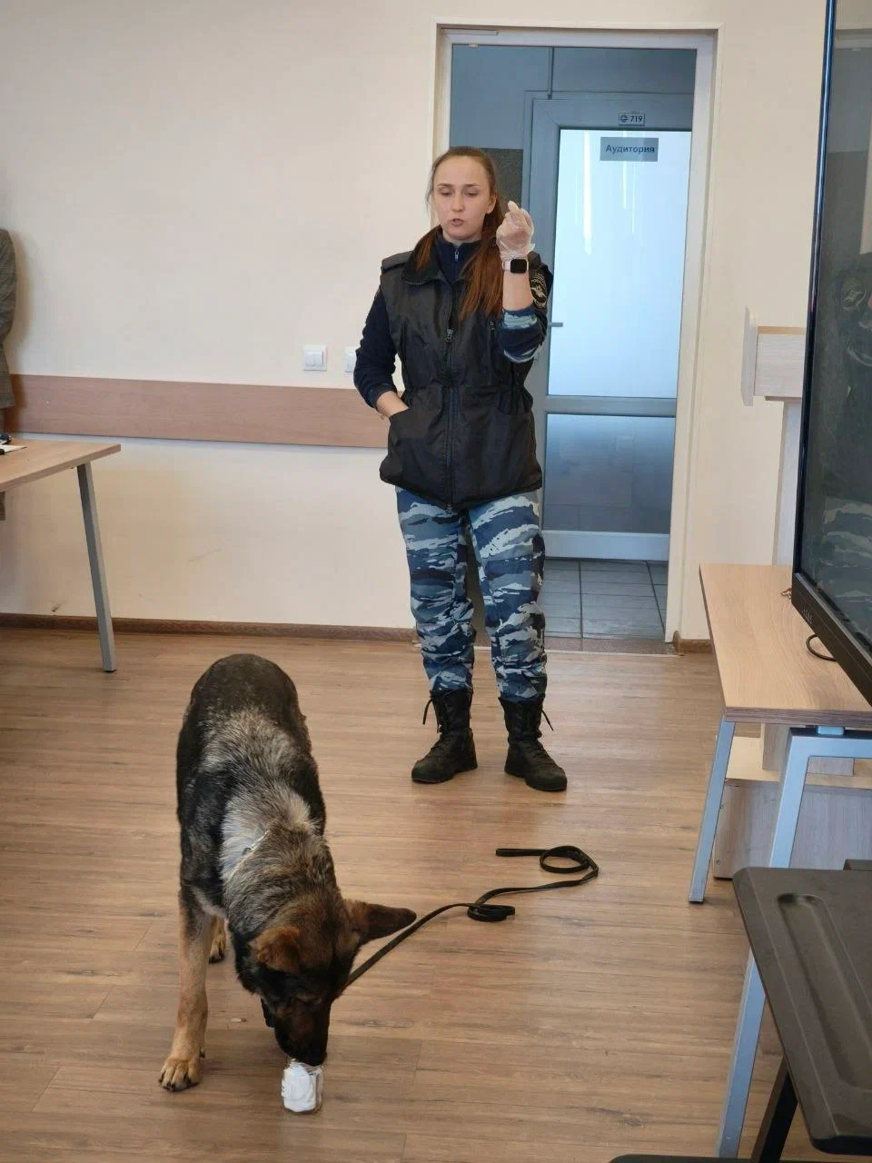 Разрядка и одновременно новый виток интереса случились, когда слово взяла кинолог Центра кинологической службы УМВД России по Калининградской области Мария Семенова. На импровизированную сцену вместе с ней вышла ее хвостатая напарница — воспитанница Готика.