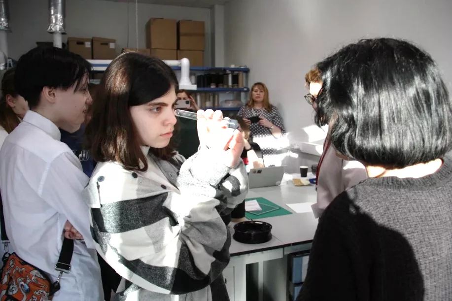 Ребята отправились в увлекательное путешествие по лабораториям научно-технологического парка «Фабрика». Председатель совета и младший научный сотрудник НОЦ Валерия Колесникова провела экскурсию — юные гости узнали, как живут и работают современные ученые. В лабораториях молодые исследователи показали, как создаются умные материалы, которые уже сегодня меняют нашу жизнь. Ребята смогли сами провести эксперименты: определить, какая «умная» нить самая прочная, протестировать «умную» стельку, увидеть, как рождается молния, и даже заглянуть в мир наночастиц и биологических клеток.
