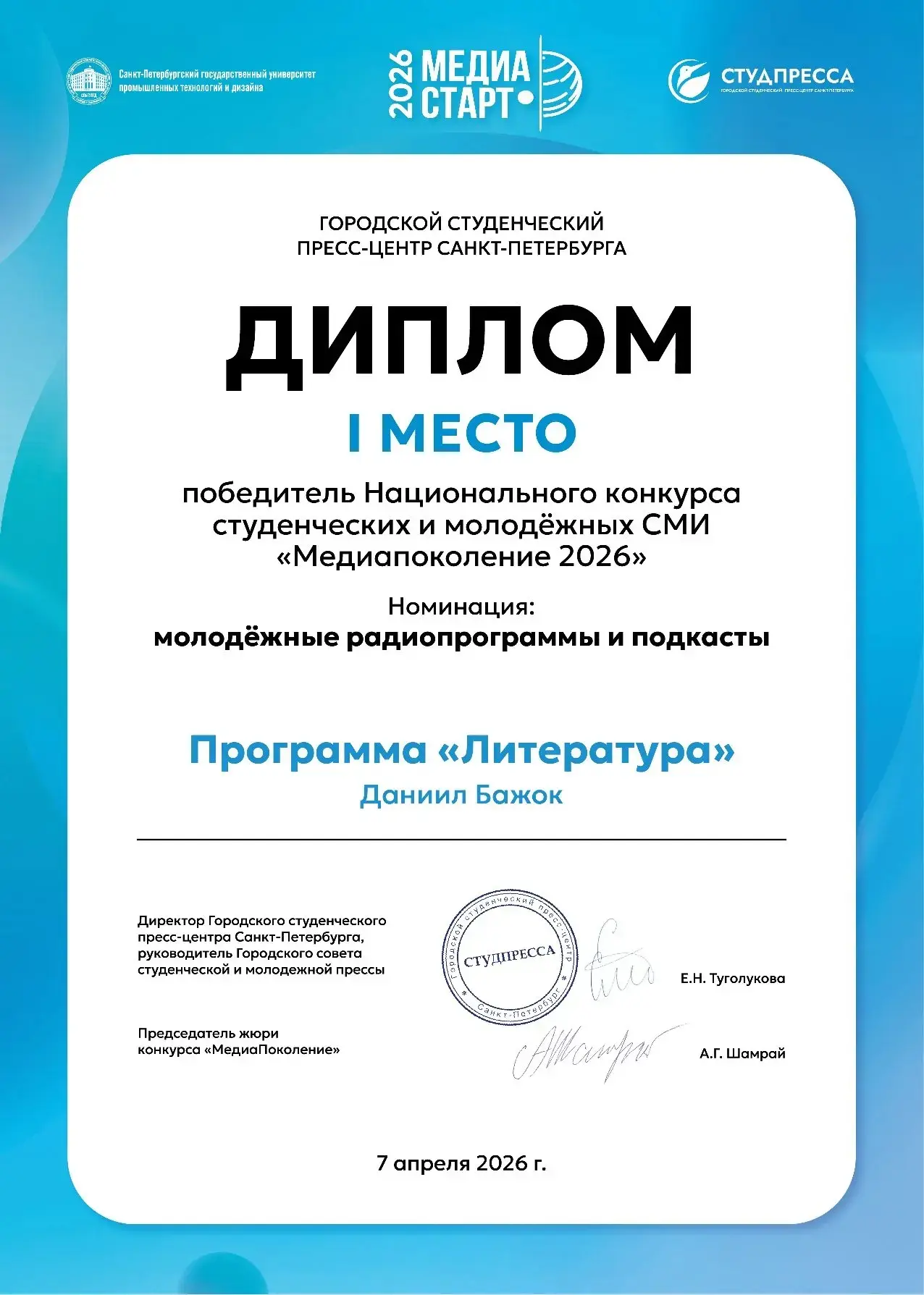 | Для меня эта победа стала полной неожиданностью — я вообще не знал, что участвую в конкурсе! О первом месте узнал в тот же момент, что и о самом факте участия. От этого, конечно, эмоции были только ярче. Изначально это была итоговая работа по дисциплине «Творческие студии», возможно, поэтому подкаст получился таким живым: не было мыслей о том, как угодить жюри. Но победа принадлежит не только мне, но и приглашенному гостю — профессору Гильманову. Ведь именно он наполнил выпуск смыслом, я лишь оформил его повествование. Огромное спасибо преподавателям за помощь в создании работы, за возможность поучаствовать в конкурсе и почувствовать ту самую сладость победы! |