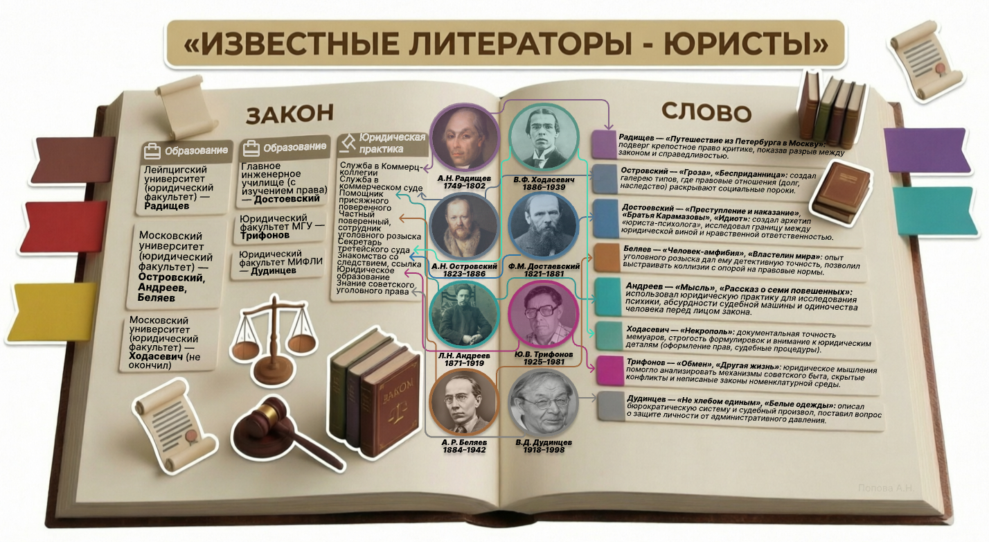 | Свое участие в номинации «Известные литераторы — юристы» связываю с убеждением, что профессиональная компетентность юриста требует не только знания права, но и понимания психологии человека. На конкурс я представила инфографику, включающую биографии и творчество 8 отечественных писателей, которые имели юридическое образование или правовую практику. Увлекает тот факт, что знание права обогащало литературу точностью анализа, а литературный талант позволял авторам видеть за юридическим событием человеческую судьбу. Именно диалог права, психологии и слова составил основу представленной мной работы. |