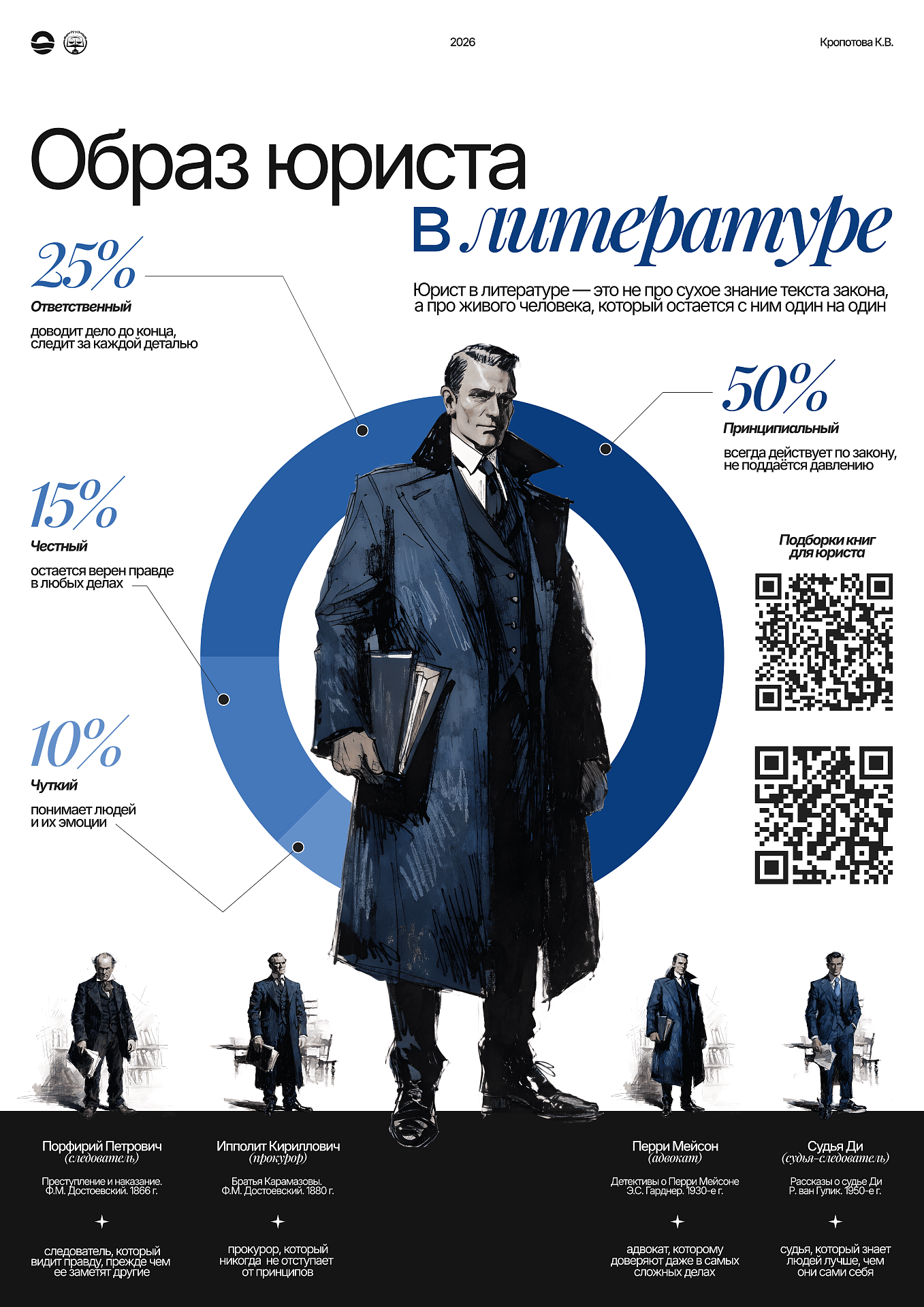 | Свободное от учебы время я посвящаю дизайну, поэтому с удовольствием решила поучаствовать. Одной из задач конкурса является выявление особенностей правосознания, правовой культуры и профессионального поведения юриста, в связи с этим я решила показать образ юриста в литературе. Задумка заключалась в том, чтобы обозначить центральные фигуры юристов в известных художественных произведениях, описать черты их характера и на этой основе составить собирательный образ, что и получилось в итоге. |