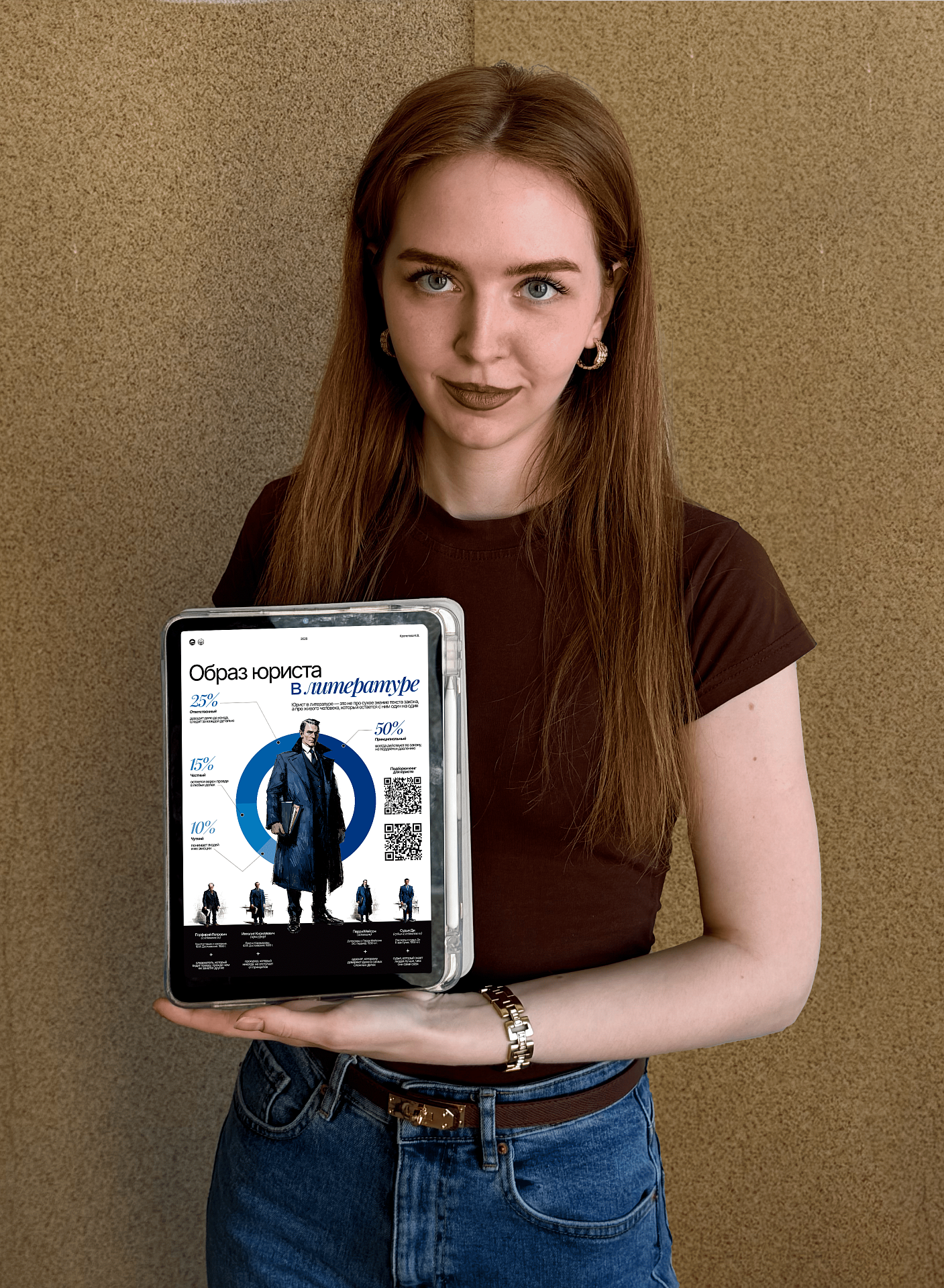 | Это был первый опыт участия в конкурсе цифровых работ, который оказался весьма удачным. Избранная тематика налагала большую ответственность в творческих решениях — нужно было проанализировать произведения, отражающие идеи права, формирующие образ юриста, выявить в биографиях писателей профессиональный опыт их участия в юридической деятельности. Студенты подготовили работы в формате инфографики, проявив оригинальность, креативность и гибкость мышления. |