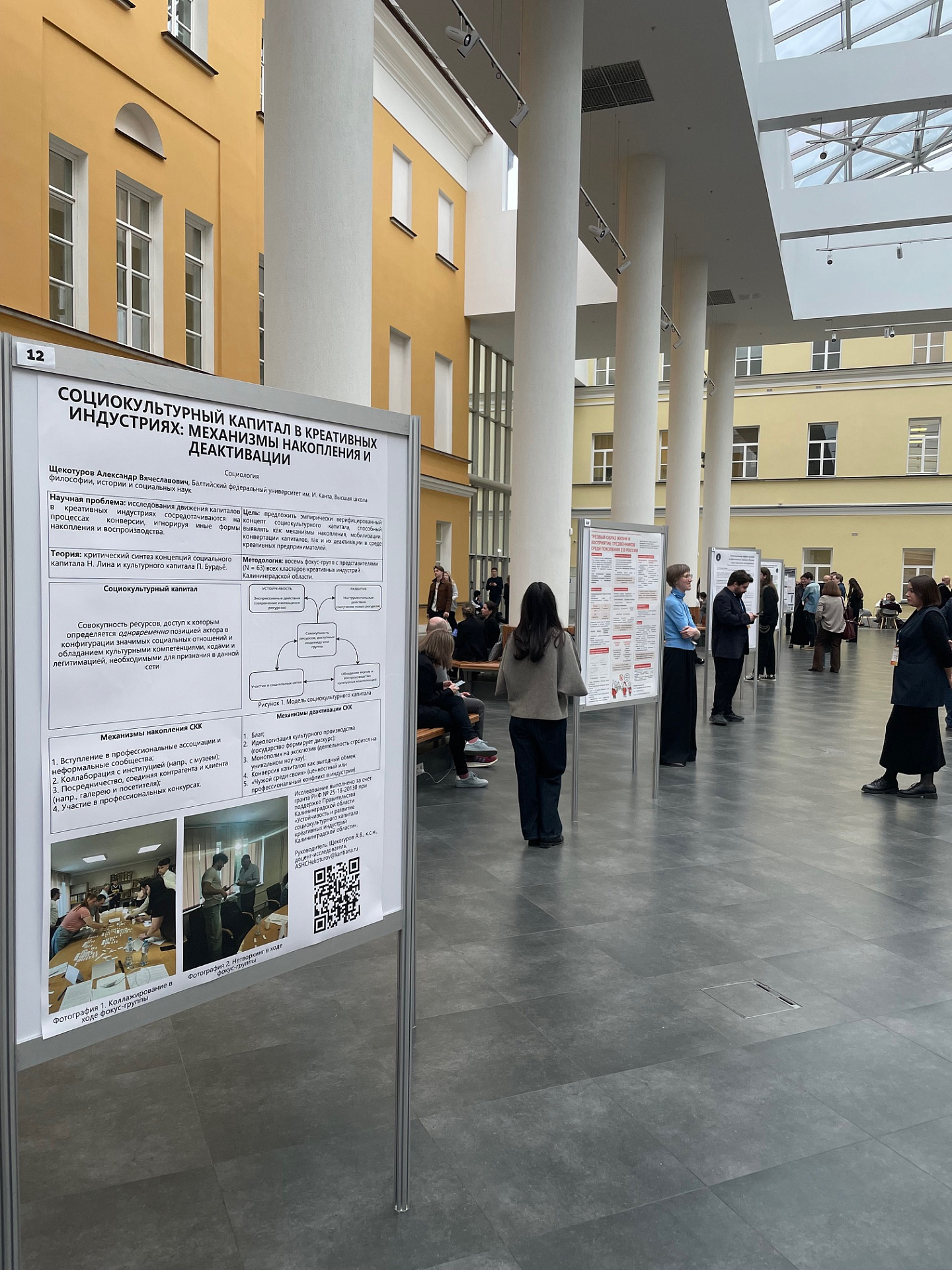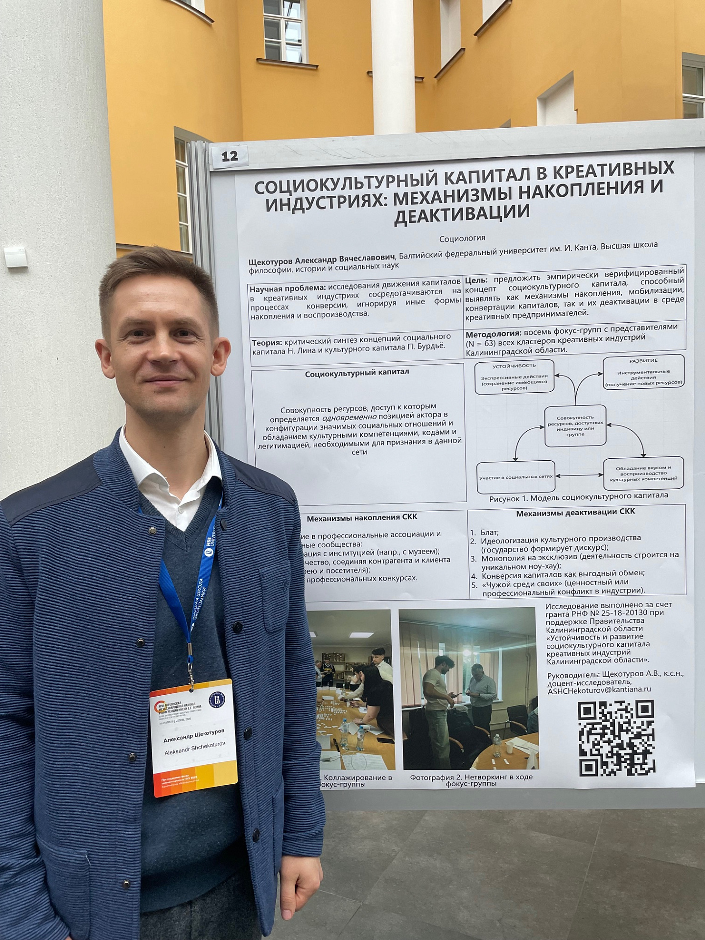 В рамках постерной сессии результаты своего научного исследования представил доцент-исследователь БФУ им. И. Канта Александр Щекотуров. В своем докладе «Социокультурный капитал в креативных индустриях: механизмы накопления и деактивации» эксперт представил основные идеи авторской концепции социокультурного капитала, которая проходит свою апробацию на обширном эмпирическом материале.
